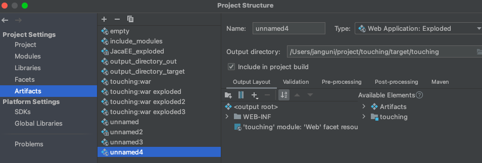 사진대로 예시를 들자면 /Users/janguni/project/touching/target/touching 밑에 WEB-INF 디렉토리와 war 파일이 생겼다.